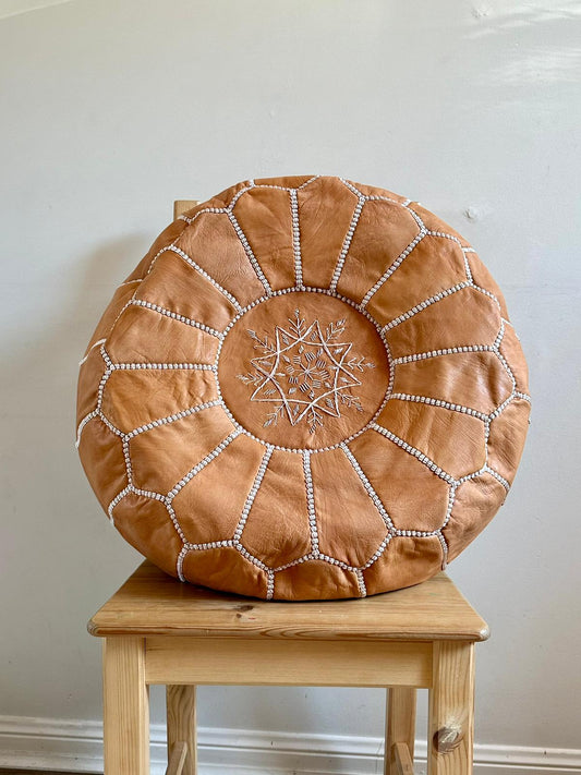 Tan leather ottoman with white stitching